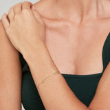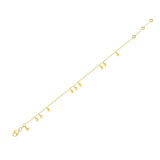 This delicate and playful 14 karat gold bracelet features dangling tribal gold charms. Its simple style mixes and matches easily with other jewels and is the perfect accessory for a boho- glam look.